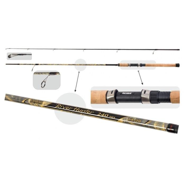 Akara River Hunter ruošinių gamyboje naudojama medžiaga - Toray grafito prekės ženklas TX-30 (40 tonų), prisideda prie padidėjusio verpimo strypų jautrumo, išlaikant stiprumo charakteristikas. Lengvos kreipiančiosios Kujira XR Long Super Hard ZrO2 (1600-1800H, kg/mm2) ant meškerės sumontuotos naudojant New Guide System technologiją, o meškerykotis išlaiko savo pirmines savybes. Aukštos kokybės kamštinė rankena. Pateikta dviem bandymais 7-28 ir 10-45g.